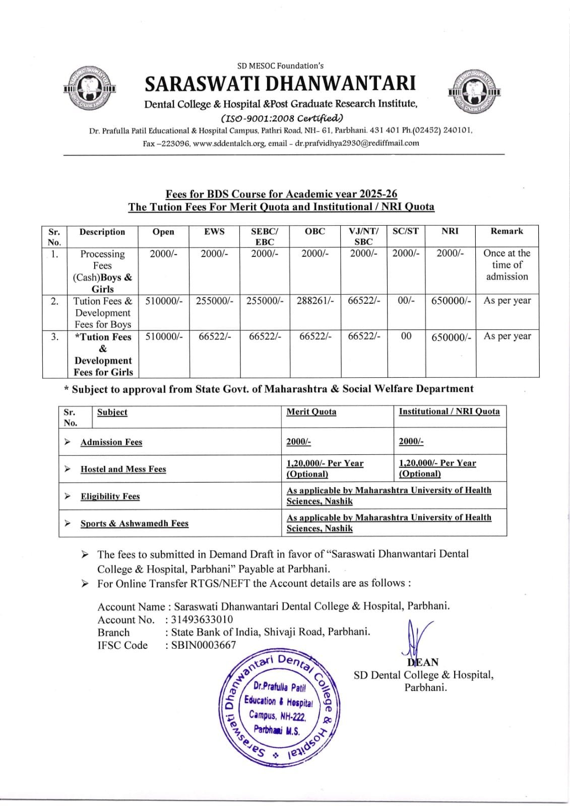 BDS Fee Structure
